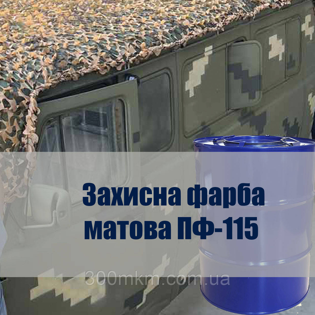 Матова захисна ПФ 115 фарба призначена для фарбування поверхні, що піддаються атмосферним впливам, загрунтованої військової техніки. Є декоративно-лакофарбовим матеріалом промислового ремонту та підфарбовування металевих частин військової авто техніки.